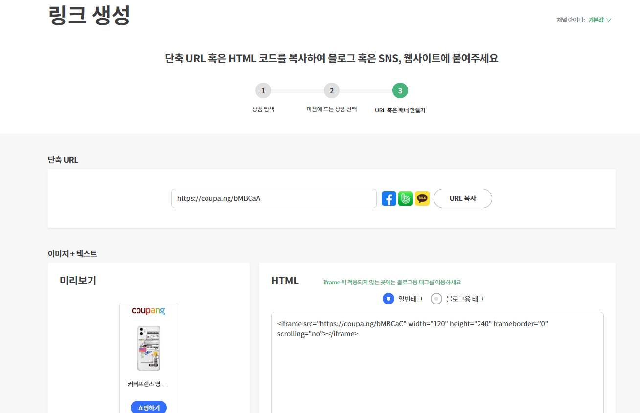 그런 다음 저 쿠팡 링크 url을 복사 해서