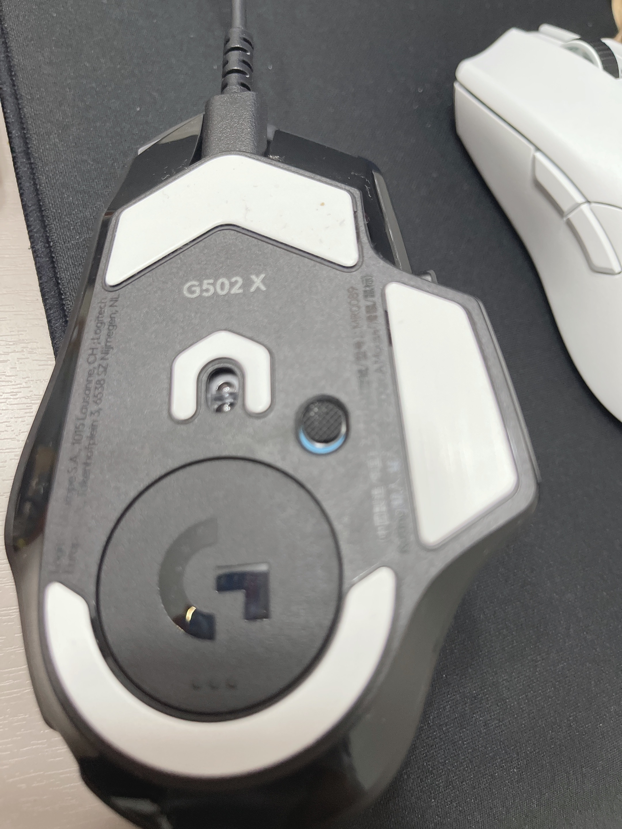 로지텍 g502x lightspeed 무선 마우스 뒷면 흰색부분은 테이프인줄 알고 떼려고 했는데, 원래 디자인인듯 합니다.